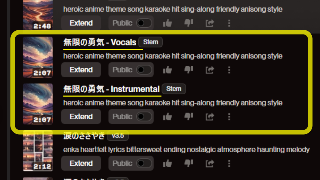 今回のアップデートで追加された新機能を使えば、Suno AIで生成した楽曲から、ボーカルとインストゥルメンタルを簡単に分離することができます。