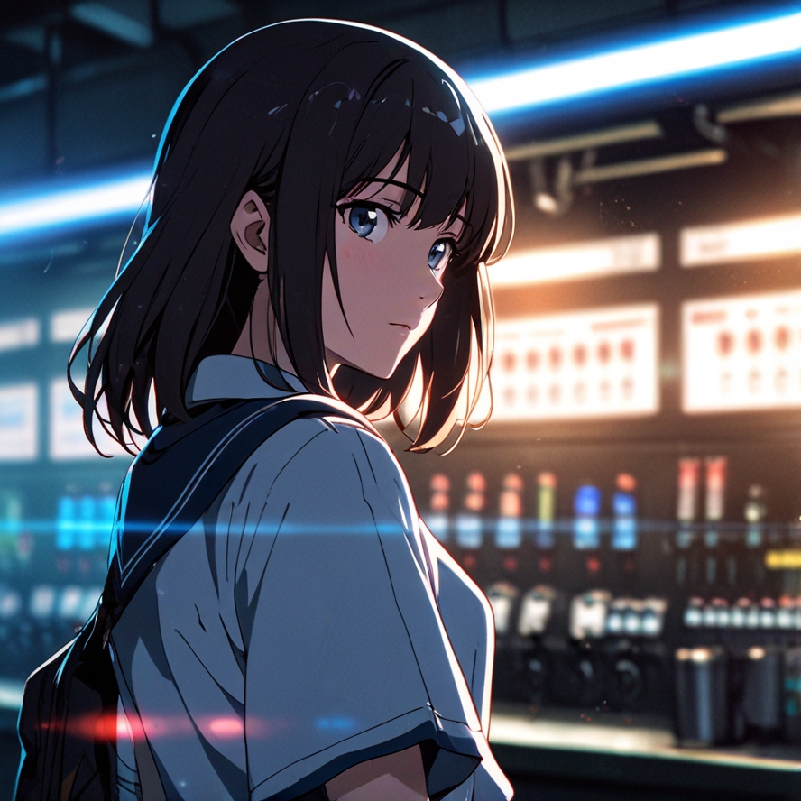 (((ヘッドホンをする))).(((名画))).((トップをねらえ!ポーズをとる女性)). ((1980年代アニメ)). ((City Pop girly)). キュートなショートヘア。ゴージャスな特徴。ハイパーディテール。高精細。アニメスタイル。HDR。8k. 幻想的なキャラクターと、より大胆な配色や要素とのコントラストが、この作品に魅力的な物語性を与えている。 ペインテッド・リアリズム, フォトリアリスティック, ファンタジーデジタルアート,レンダー関連情報: 32K解像度,広角.表現力豊かなディテール, 季節:夏, 時間:真夜中, (((未来の東京基地で働く))).(笑顔).月明かりが薄暗い部屋を照らす.80年代.((全身))