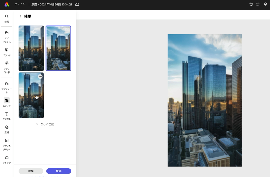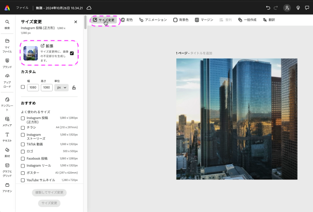 しかし、今回のアップデートで追加された「画像の拡張」機能を使えば、AIが画像の内容を分析し、自然な形でサイズを変更してくれるため、違和感なく画像を再利用できます。