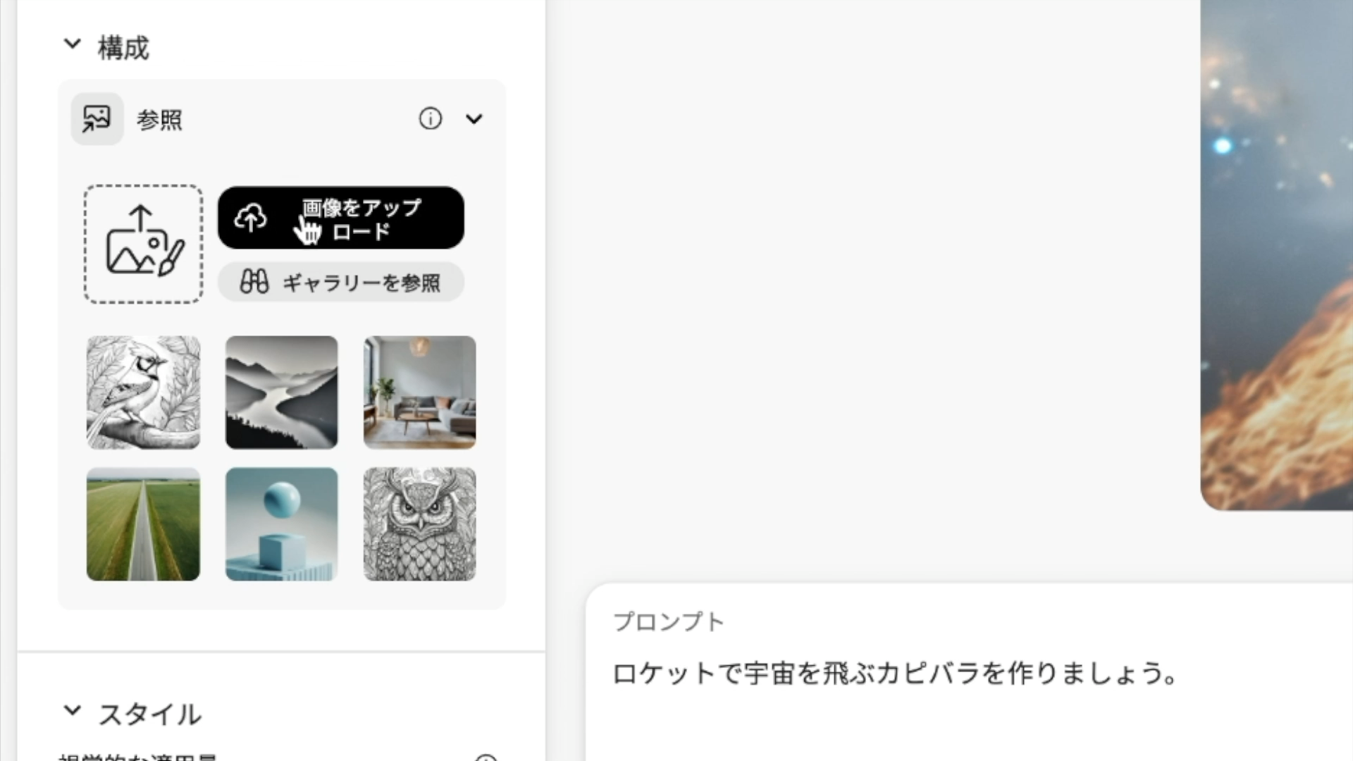 「構成参照」機能は、特定の参照画像を基に新しい画像を生成することで、ユーザーの意図に沿った詳細なディテールを再現することができます。この機能を使用すると、生成された画像はよりリアルで自然な仕上がりとなり、プロジェクトのクオリティを高めることができます。例えば、特定の光の当たり方や影の描写など、細かなディテールがより正確に反映されます。