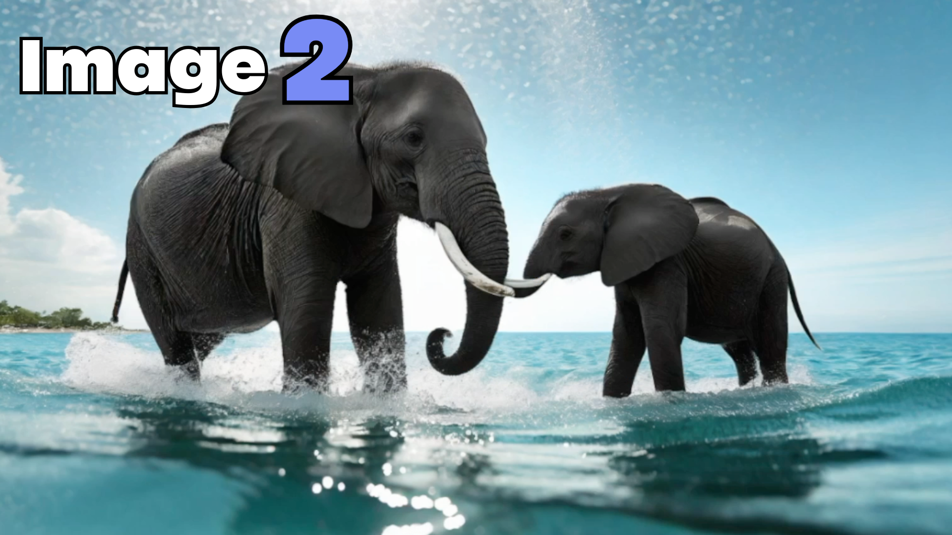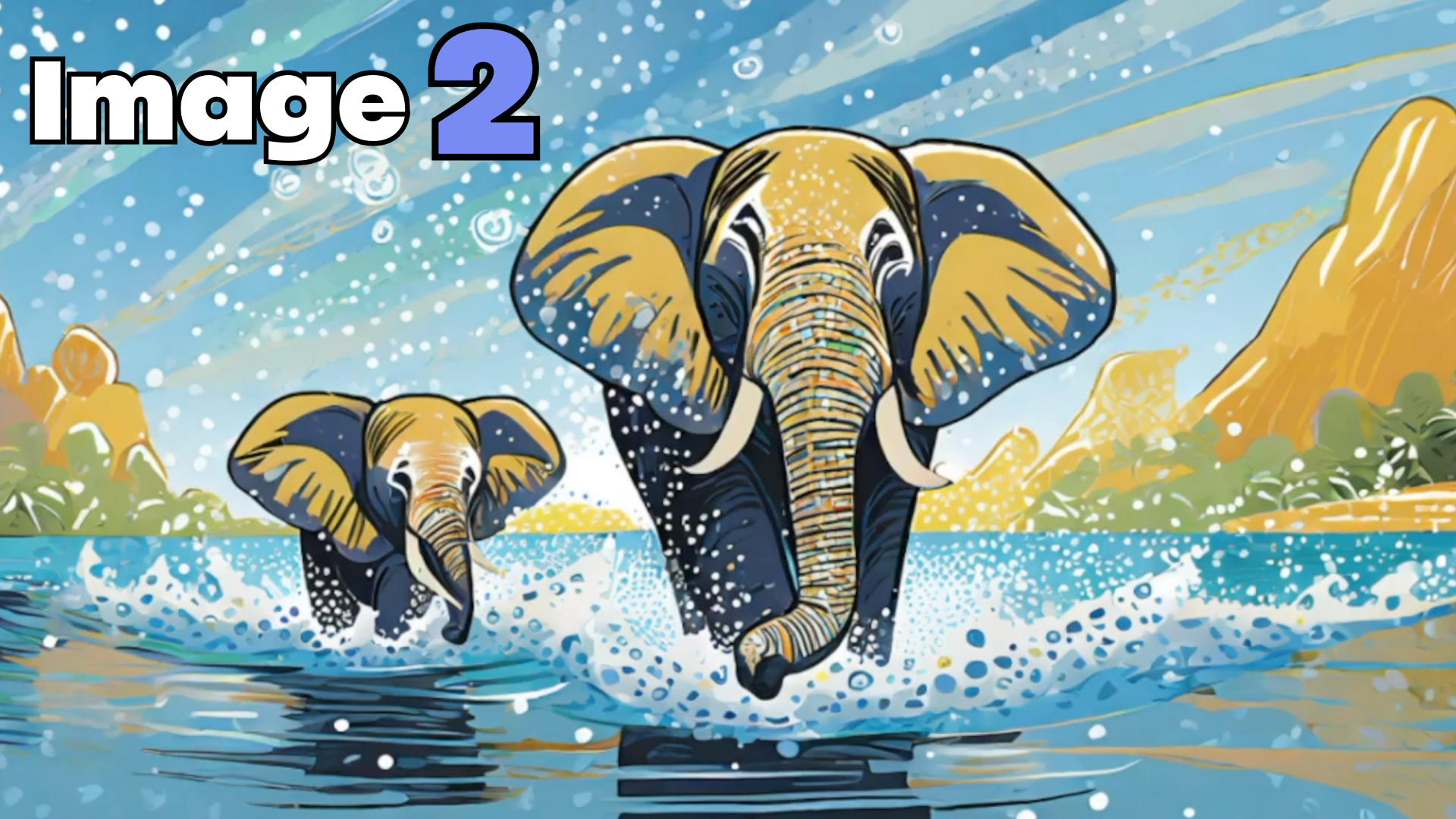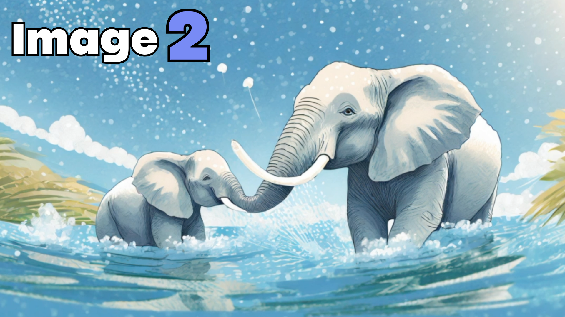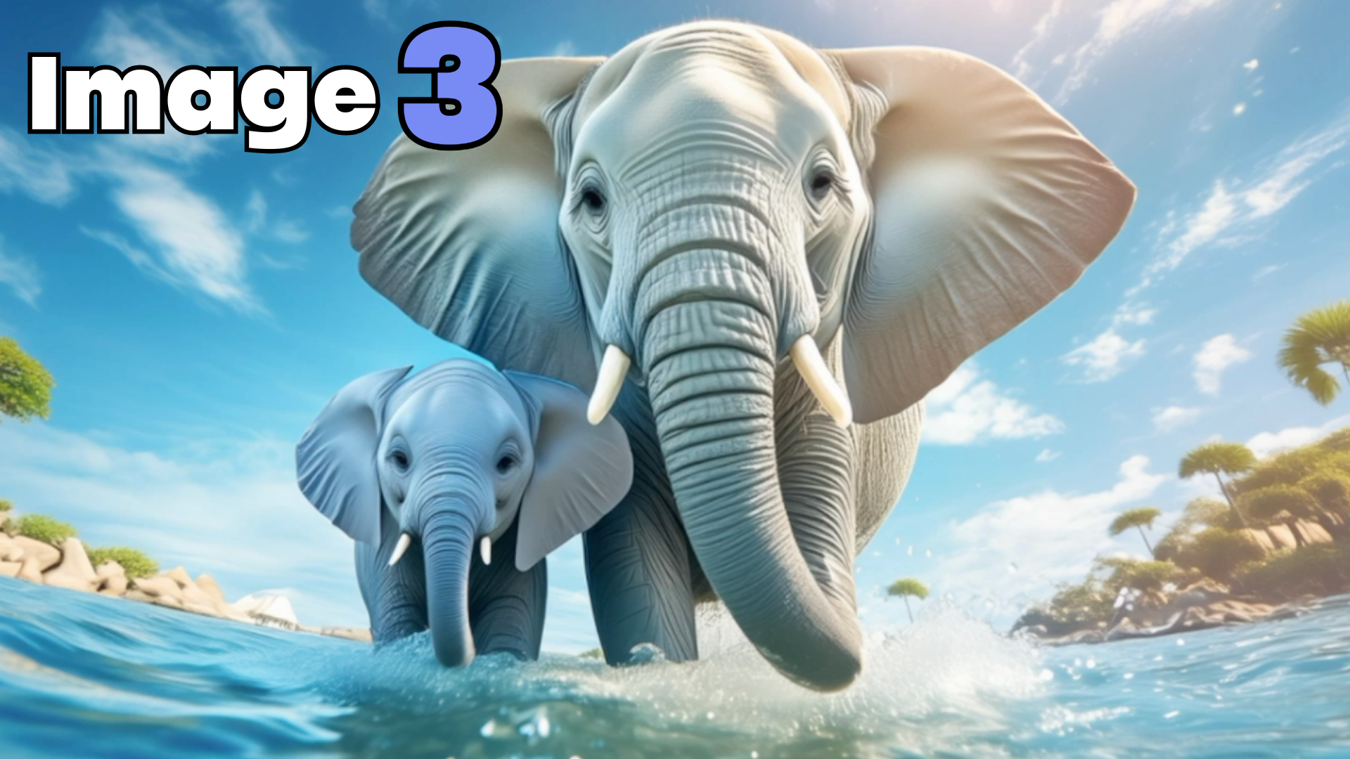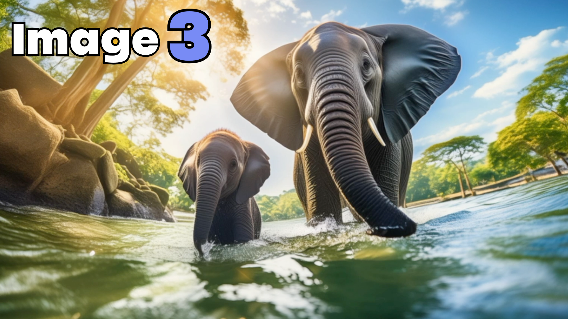 Firefly Image3:同じ条件で生成された画像は、水面から煽っているようなカメラアングルがしっかり反映され、象の皮膚の質感も非常にリアルです。比較すると、その違いは一目瞭然です。