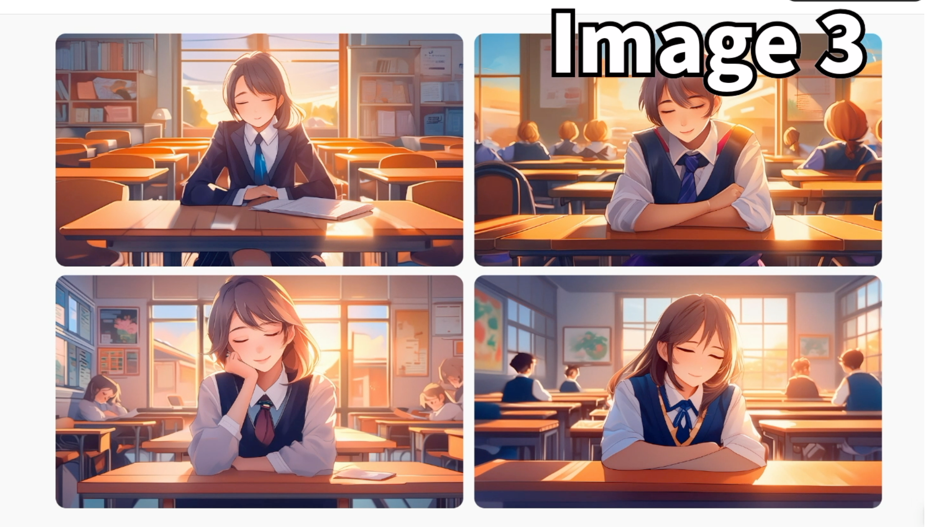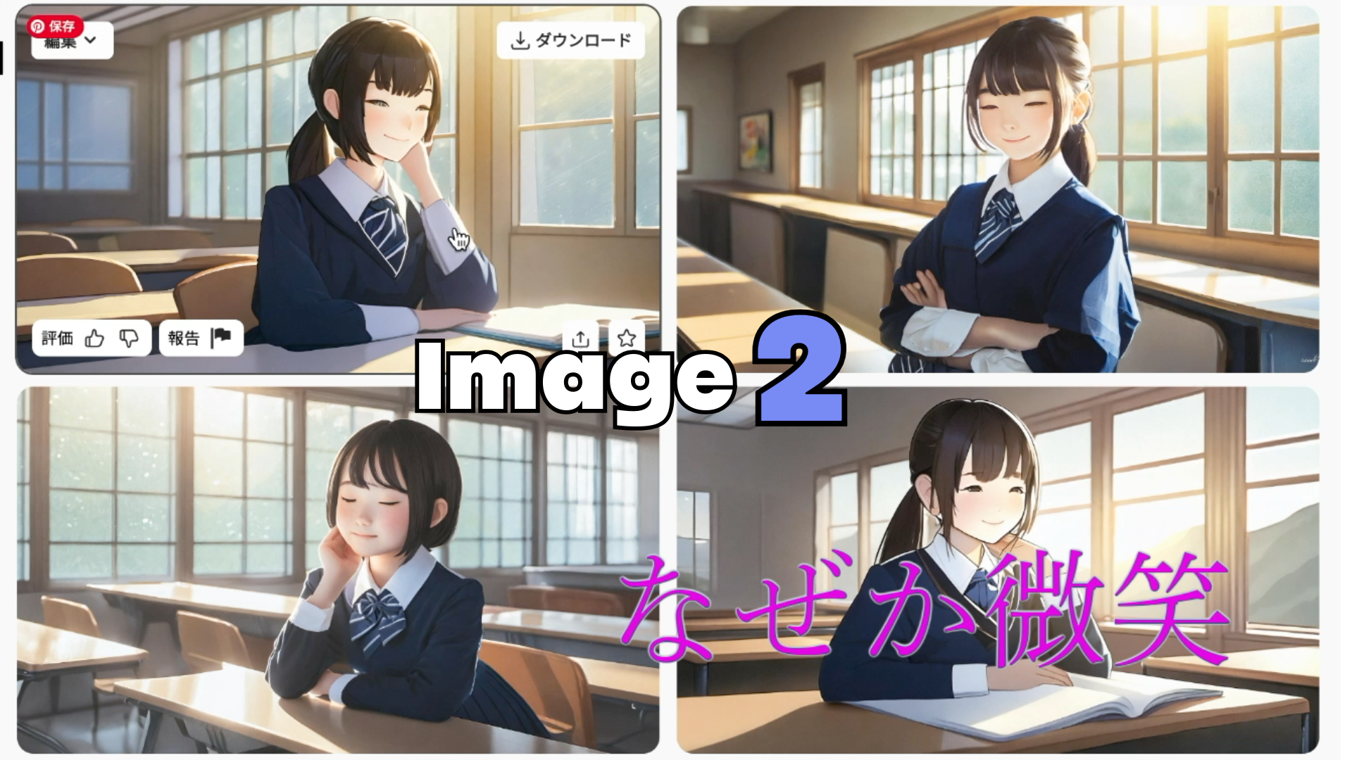 Firefly Image2:窓から夕陽がさしている背景はいいのですが、肝心の人物がなぜか目は閉じているものの微笑んでいます。顔はアニメ風で体は写実的とチグハグです。これはFireflyの弱点ですね。