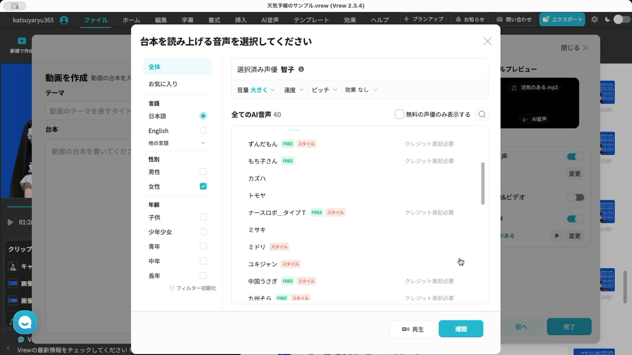 次に、Vrewを使用してAI音声で天気予報のナレーションを作成します。