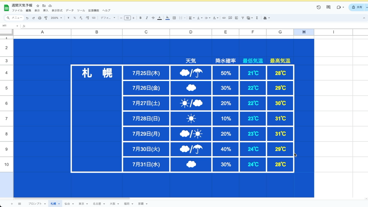 Googleスプレッドシートで天気予報のパネル図を作成し、装飾を施します。