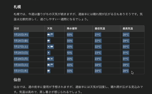 | 日付 | 天気 | 降水確率 | 最低気温 | 最高気温 |